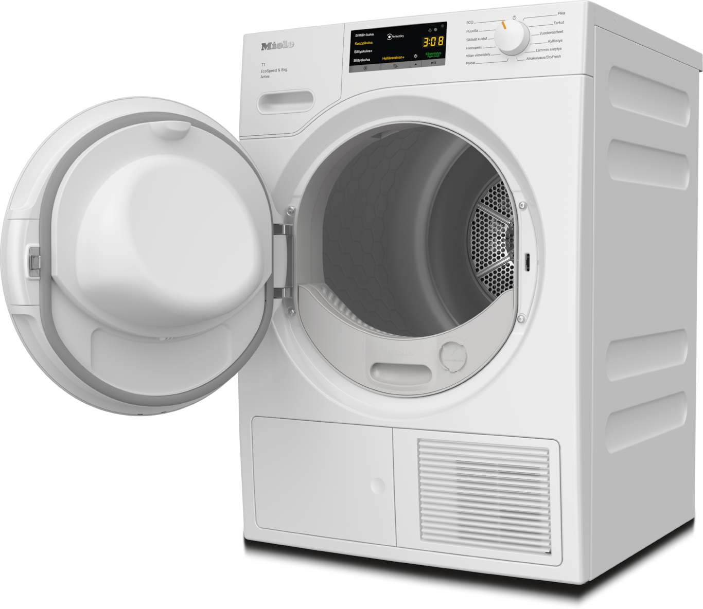 - 4.Ajan säästö laskettu verrattuna saman täyttömäärän ja energiatehokkuusluokan Miele-kuivausrumpuihin, joissa ei ole EcoSpeed-toimintoa. Testattu Puuvilla-ohjelmalla ja täydellä täyttömäärällä.