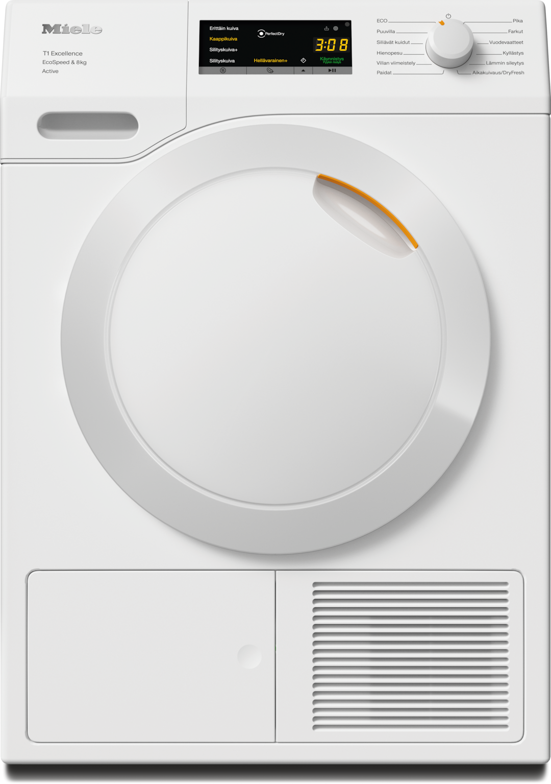 - 5.Ajan säästö laskettu verrattuna saman täyttömäärän ja energiatehokkuusluokan Miele-kuivausrumpuihin, joissa ei ole EcoSpeed-toimintoa. Testattu Puuvilla-ohjelmalla ja täydellä täyttömäärällä.