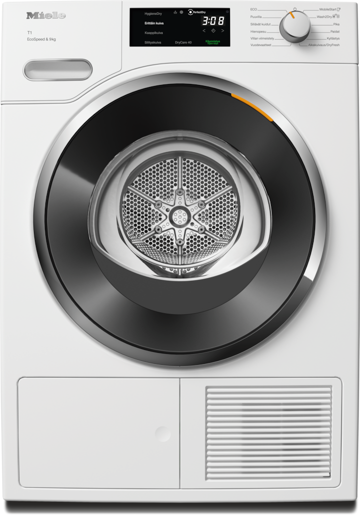 - 6.Ajan säästö laskettu verrattuna saman täyttömäärän ja energiatehokkuusluokan Miele-kuivausrumpuihin, joissa ei ole EcoSpeed-toimintoa. Testattu Puuvilla-ohjelmalla ja täydellä täyttömäärällä.