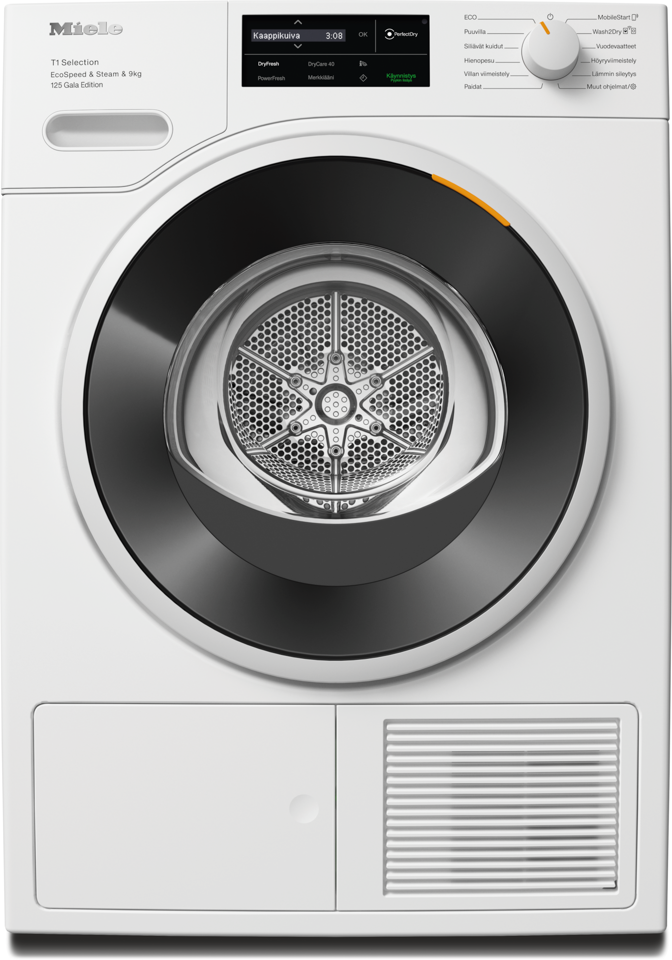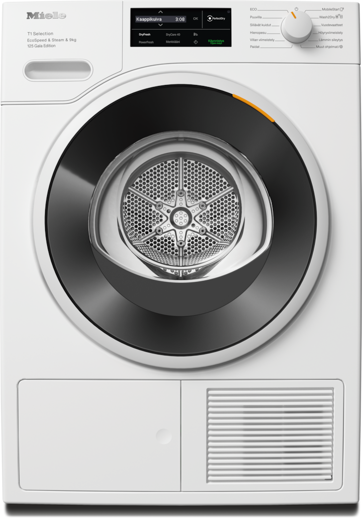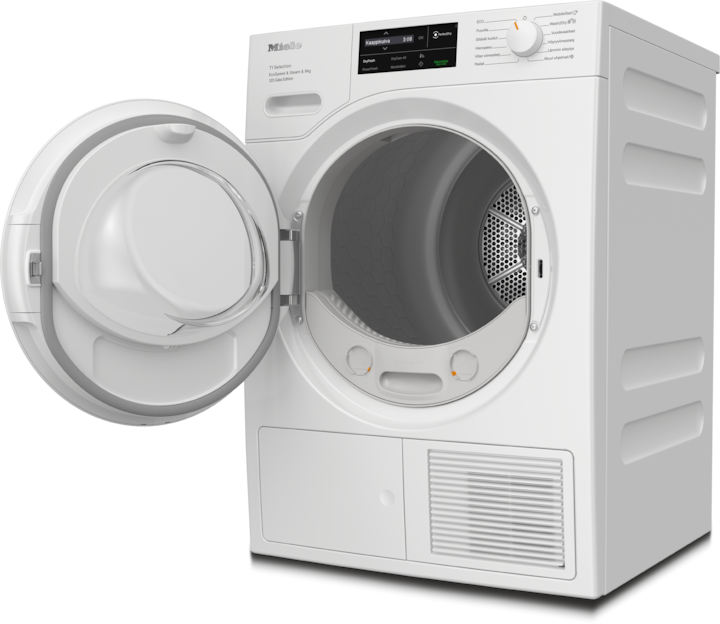 - 7.Ajan säästö laskettu verrattuna saman täyttömäärän ja energiatehokkuusluokan Miele-kuivausrumpuihin, joissa ei ole EcoSpeed-toimintoa. Testattu Puuvilla-ohjelmalla ja täydellä täyttömäärällä.