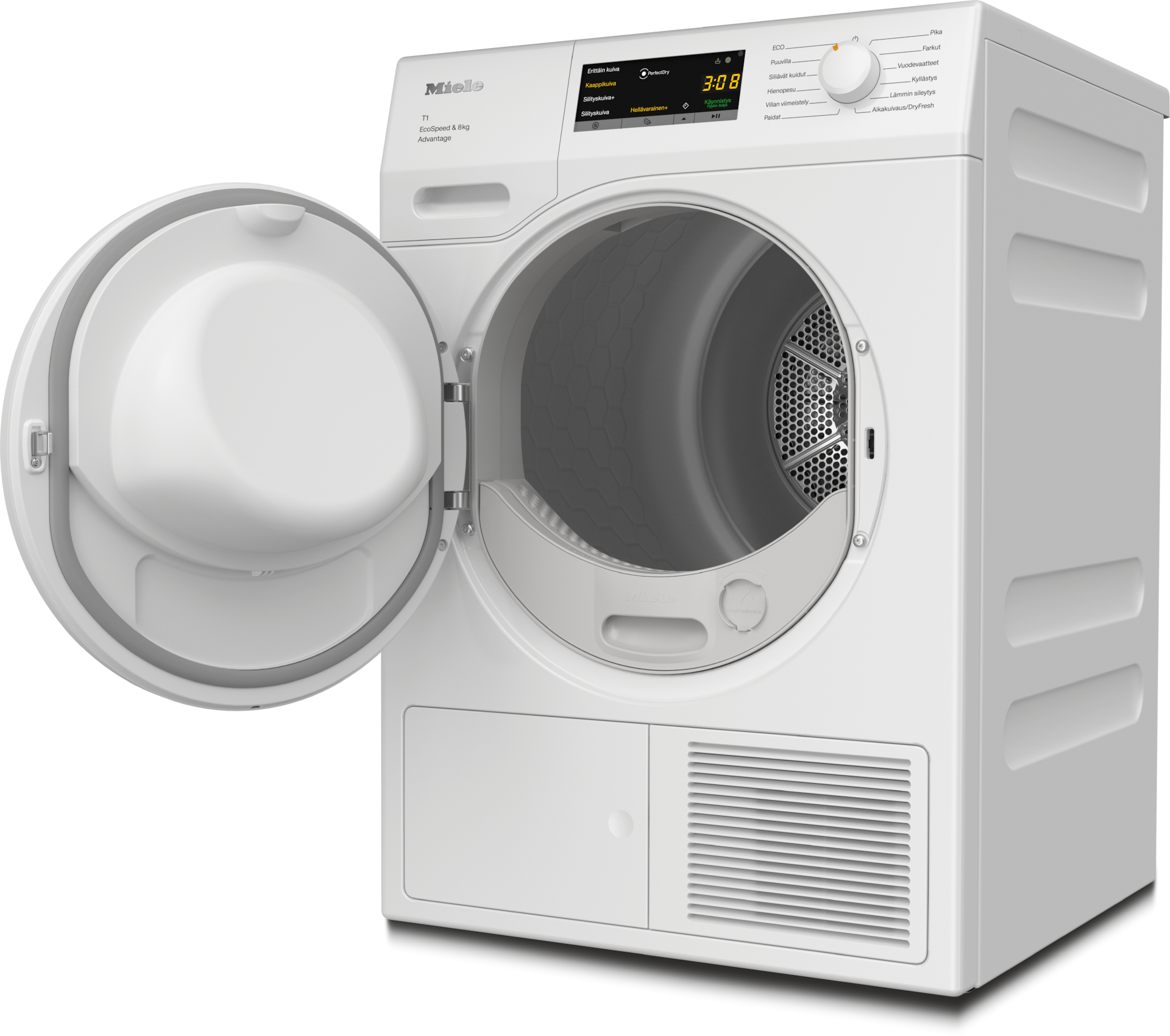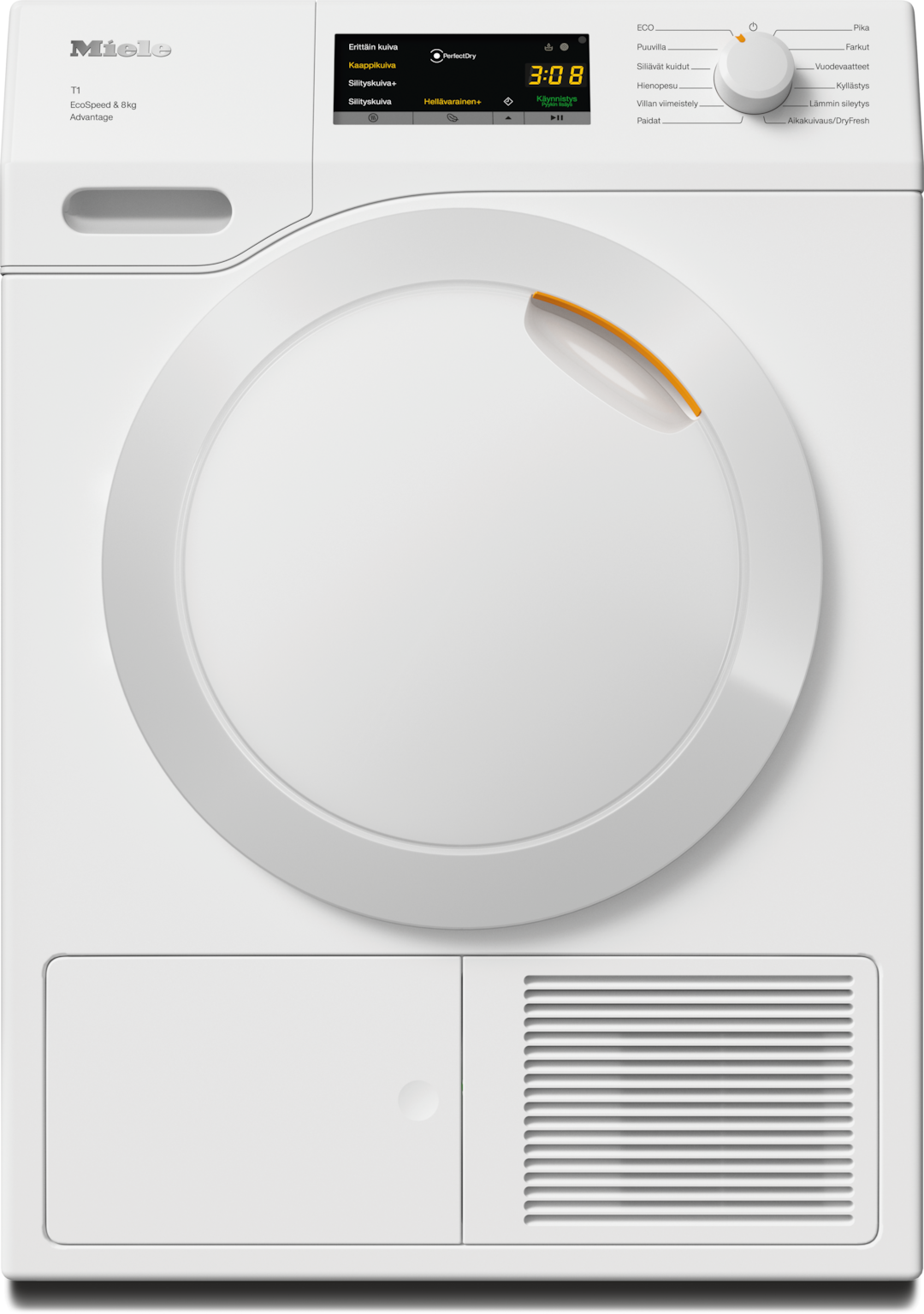 - 5.Ajan säästö laskettu verrattuna saman täyttömäärän ja energiatehokkuusluokan Miele-kuivausrumpuihin, joissa ei ole EcoSpeed-toimintoa. Testattu Puuvilla-ohjelmalla ja täydellä täyttömäärällä.